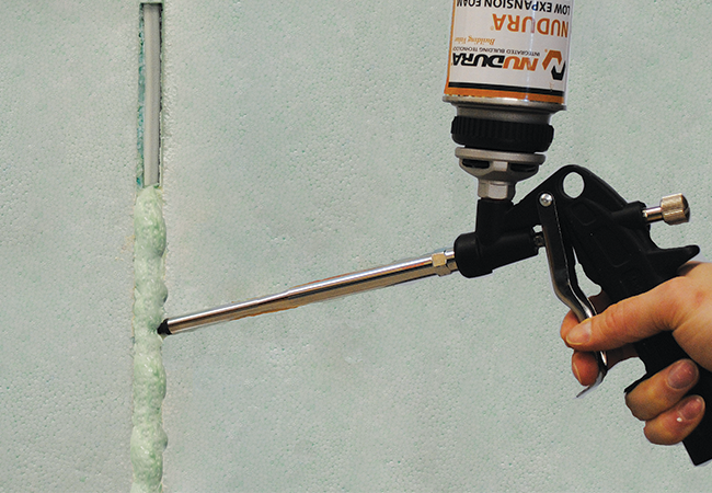 La mousse à bas foisonnement est compatible avec le polystyrène expansé de Nudura et peut être utilisée pour divers travaux sur le chantier : créer un joint étanche entre les coffrages et la semelle ou la dalle ou entre les joints montants, fixer les perforations de service ou isoler le périmètre des ouvertures.